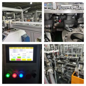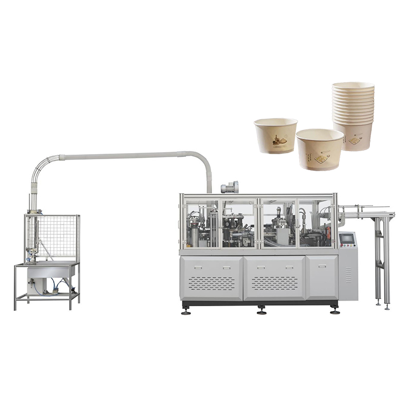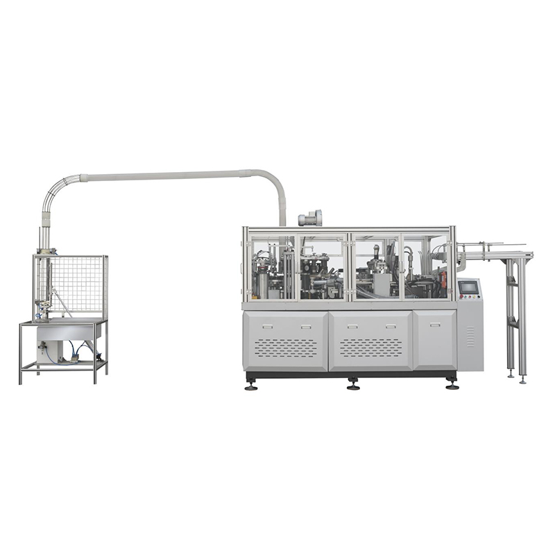 High-speed intelligent paper cup machine HF – 900S, an intelligent paper bowl machine, adopts a desktop layout, isolating the transmission components and molds. The transmission components are located under the table, while the molds are on the table. This layout facilitates cleaning and maintenance. The machine uses automatic spray lubrication, a longitudinal shaft transmission structure, a barrel-shaped cylindrical indexing mechanism and gear transmission to ensure the stability and quality of the entire machine. For electrical components, PLC, photoelectric tracking and servo feed are used to control the operation. The production capacity of this type of machine can reach 100-120 / min, suitable for producing 16-32 ounces of cold/hot cups.
